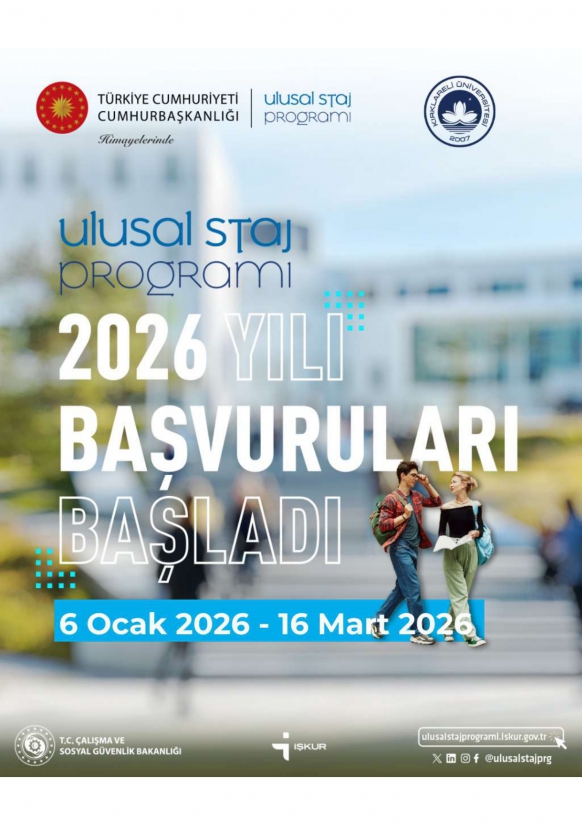 | ULUSAL STAJ PROGRAMI BAŞVURULARI BAŞLADI Kariyer Uygulama ve Araştırma Merkezi 2699 Okunma Ulusal Staj Programı, Türkiye Cumhuriyeti Cumhurbaşkanlığı himayelerinde ve İŞKUR koordinasyonunda... | 08/01/2026 |