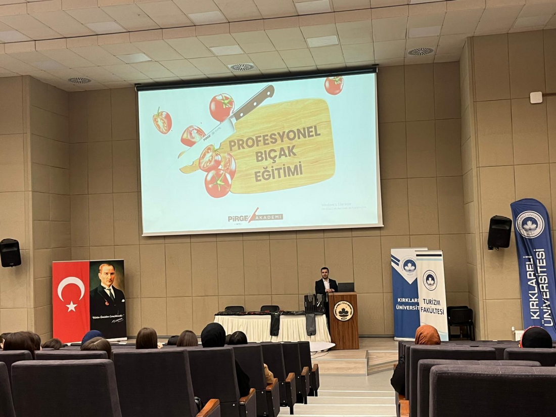 25 Kasım 2025 Çarşamba günü, Fakültemiz Gastronomi ve Mutfak Sanatları Bölümü öğrencilerine yönelik olarak Pirge Bıçakçılığın katılımlarıyla Profesyonel Bıçak Eğitimi Semineri düzenlendi. Prof. Dr. Mustafa Aykaç Konferans Salonu'nda gerçekleşen seminerde, Pirge Akademi Kurumsal Eğitim Uzmanı Fırat ERBİL tarafından mutfaklarda kullanılan bıçakların üretim süreçleri, bıçak türleri ve kullanım alanları, temel doğrama teknikleri ve HACCP uygulamaları hakkında bilgi verildi. Sunumun ardından Fırat ERBİL seminere katılan öğrencilere çeşitli sorular yönelterek doğru cevap veren öğrencilere bıçak hediye etti. Katkılarından ve değerli paylaşımlarından dolayı Fırat ERBİL ve Pirge Bıçakçılık’a teşekkür ederiz.