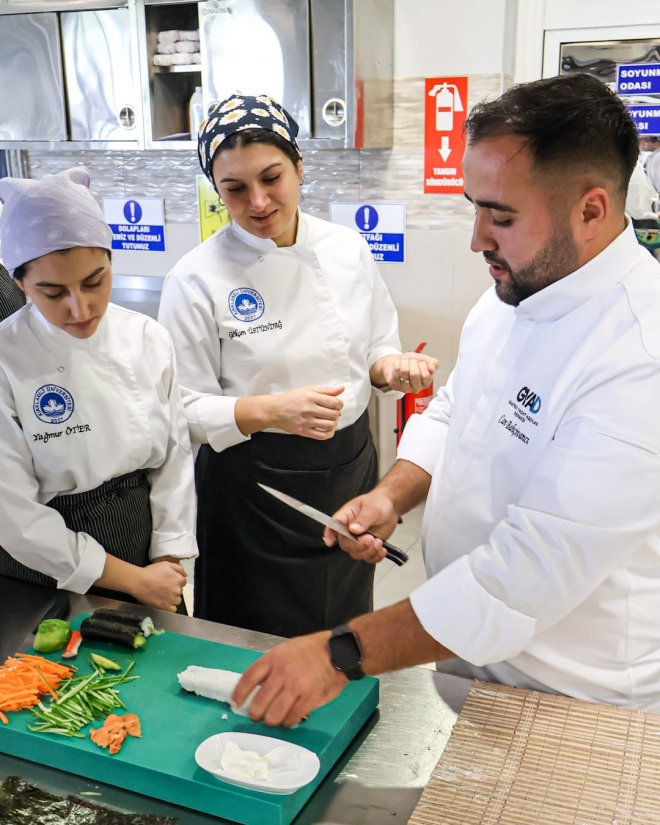 Fakültemiz Gastronomi ve Mutfak Sanatları Bölümü tarafından, 22 Aralık 2025 tarihinde saat 13.30’da Gastro Yat Aşçıları Derneği iş birliğiyle, Öğr. Gör. Raşit Bakan ve Arş. Gör. Ferda Yeliz Çubuk’un katkılarıyla “Sushi Yapım Atölyesi ve Yat Şefliği Kariyer Yolculuğu ve Sektör Tecrübeleri” başlıklı etkinlik düzenlenmiştir.