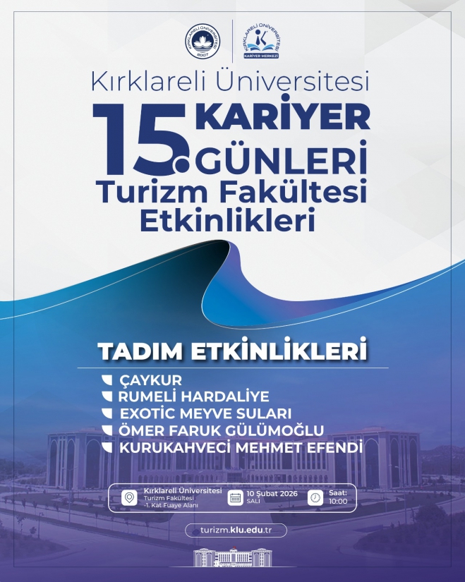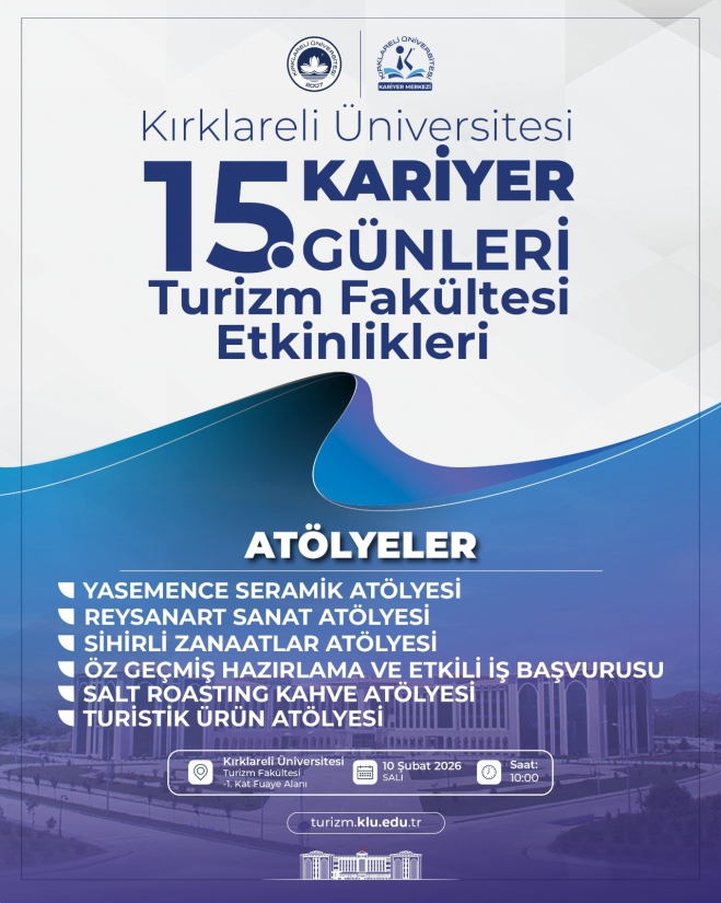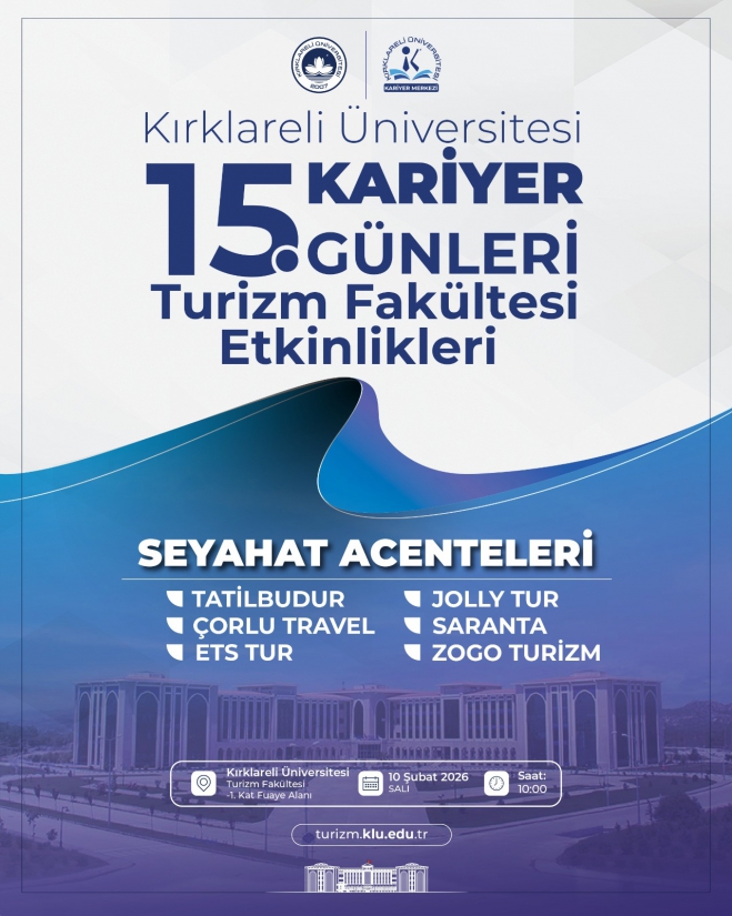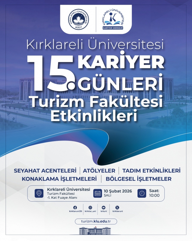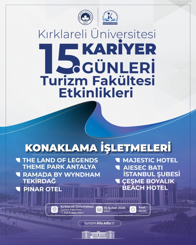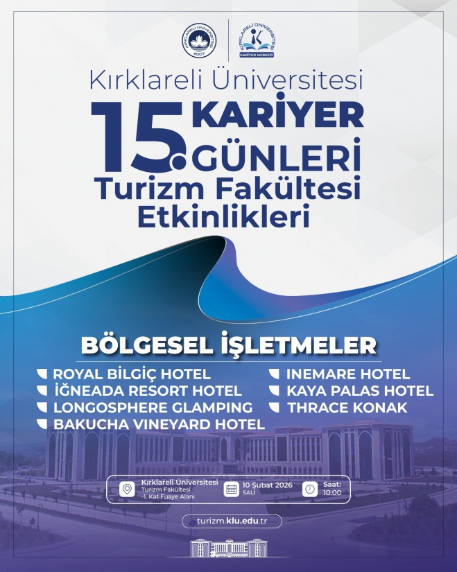 Fakültemiz bünyesinde, üniversitemiz Kariyer Merkezi koordinasyonunda 15. Kariyer Günleri Turizm Fakültesi Etkinlikleri düzenlenecektir.