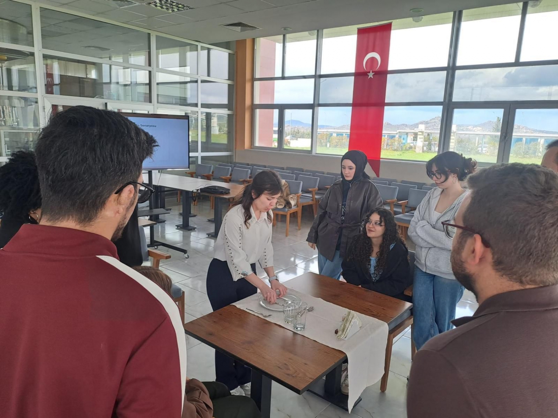 Eğitim kapsamında servis teknikleri, masa düzeni, misafir karşılama ve etkili iletişim süreçleri uygulamalı olarak ele alınmış, öğrencilerin hizmet kalitesini artırmaya yönelik mesleki bilgi ve becerilerinin geliştirilmesi hedeflenmiştir.